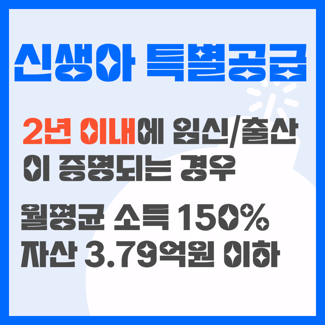 '23년 8월 29일 자로 국토부에서 발표한 저출산 극복을 위한 주거지원 방안에 신생아 출산 시 특별공급(신생아 특공)을 통해 혼인 여부와 관계없이 출산 자체만으로 공공분양 주택청약을 통한 특별공급을 지원하는 내용이 포함되어 대상과 기준을 아래와 같이 소개드립니다. ① 공공분양 신생아 특별공급 신설 (개요) 혼인가구를 중심으로 한 신혼부부 특별공급과 달리 혼인 여부와 무관하게 자녀 출산 시 공공분양(뉴:홈) 특별공급 (대상) 입주자모집 공고일로부터 2년 이내 임신·출산이 증명되는 경우 특별공급 자격 부여 (임신인 경우 입주 전까지 출산 증명 필요) (소득·자산) 도시근로자 월평균소득 150%․자산 3.79억원 이하 (공급물량) 연 3만호 수준 공급 * 뉴:홈 공급물량 일부 조정(세부 공급계획 추후 확정)..